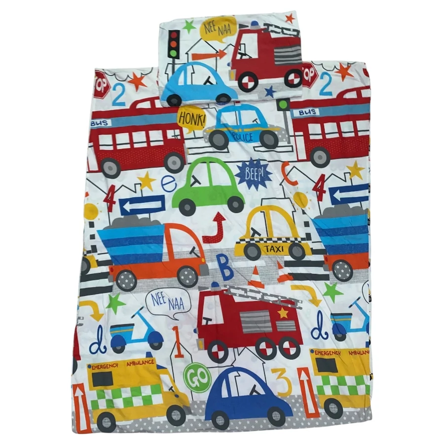 Járműves ovis ágynemű huzat, patentos, gyerek méret, párna: 38x58 cm, paplan: 113x142 cm.